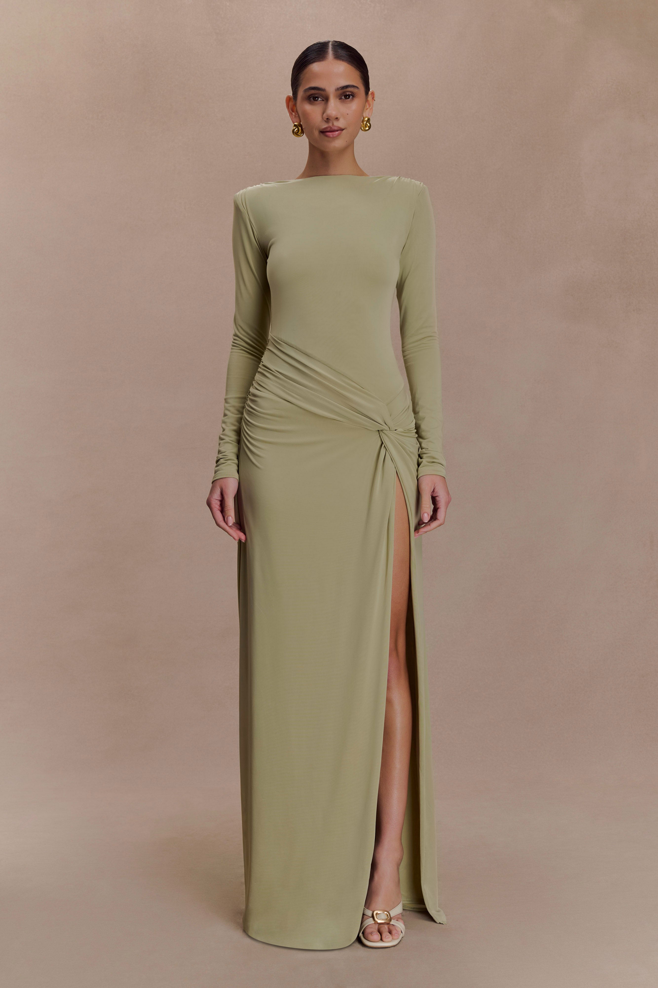 The DEANNA Long Sleeve Gathered Maxi Dress is a confident take on classic evening wear. Framed by a boat neckline and statement shoulder pads, this dress creates a bold yet feminine silhouette. Its bodycon fit is elevated with a front waist twist and gathered hip detail, designed to enhance and define. A thigh-high side split adds subtle drama, while the partially lined finish keeps the look sleek and sculptural. Perfect for nights that call for quiet power and polished allure.