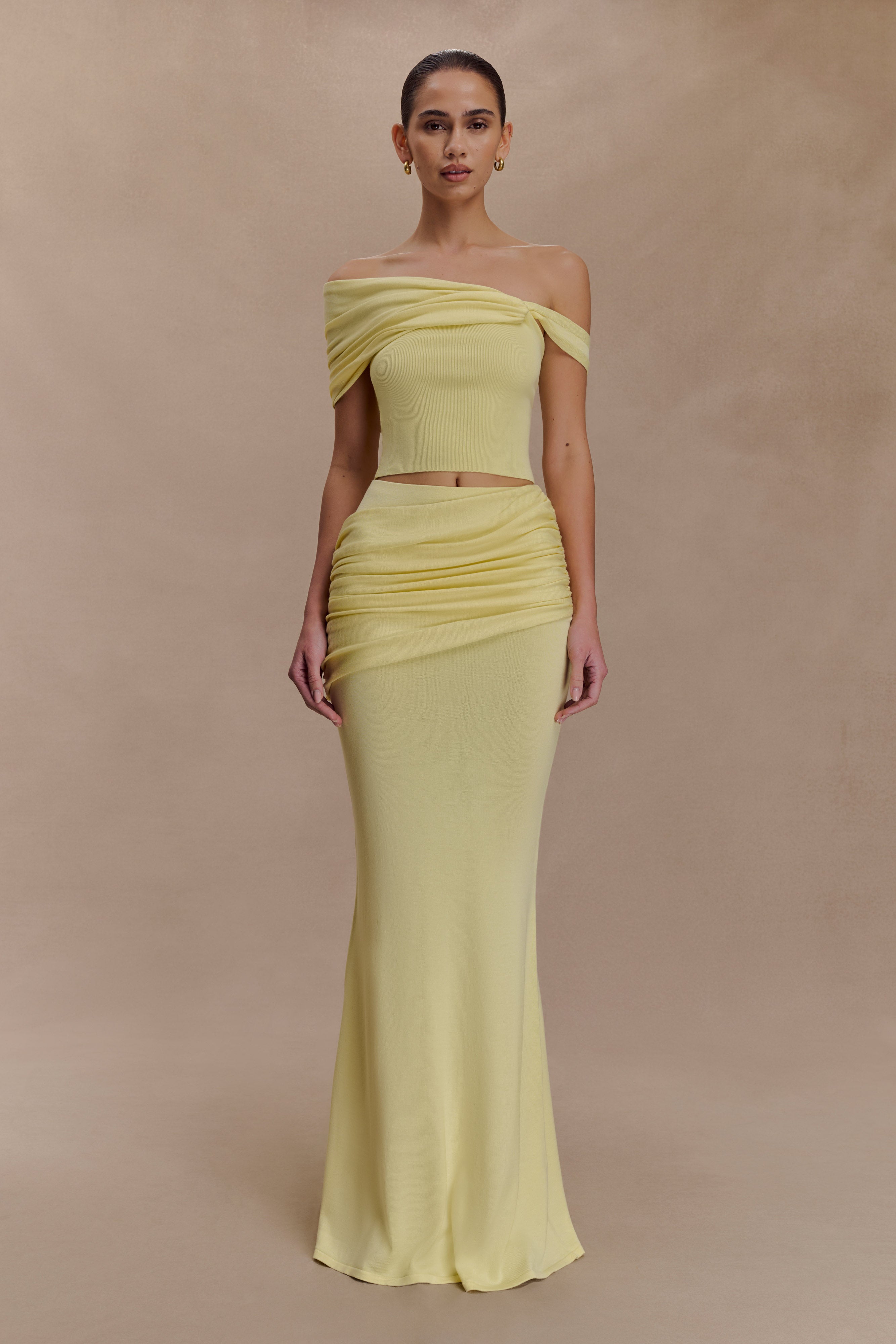 The IRENE Gathered Knit Maxi Skirt is a sleek, sculptural piece designed to flatter. Crafted in a soft jersey with a draped overlay, this pull-on skirt hugs the body in a bodycon fit before flaring into a mermaid shape for fluid movement. Unlined for a lightweight feel, it offers effortless sophistication with a modern edge. Pair it with the Irene Gathered Knit Top for a coordinated ensemble that exudes confidence and refined allure.